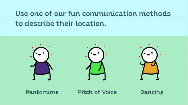 Disclaimer: Only choose one version of communication at once. You cannot use language to describe the hiding place.